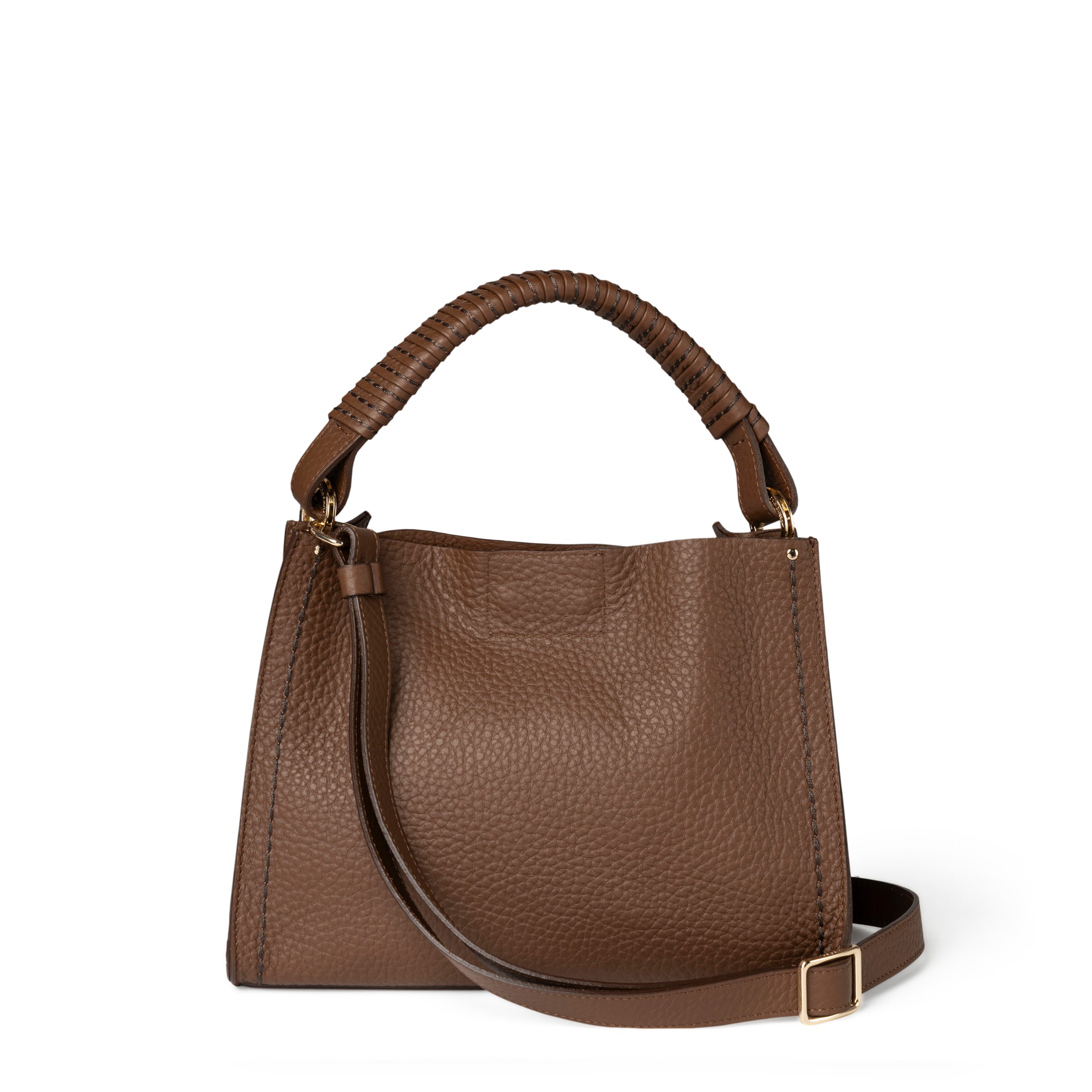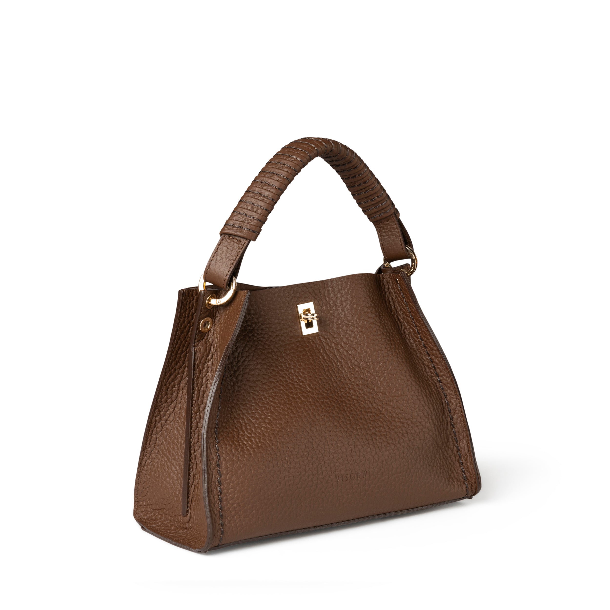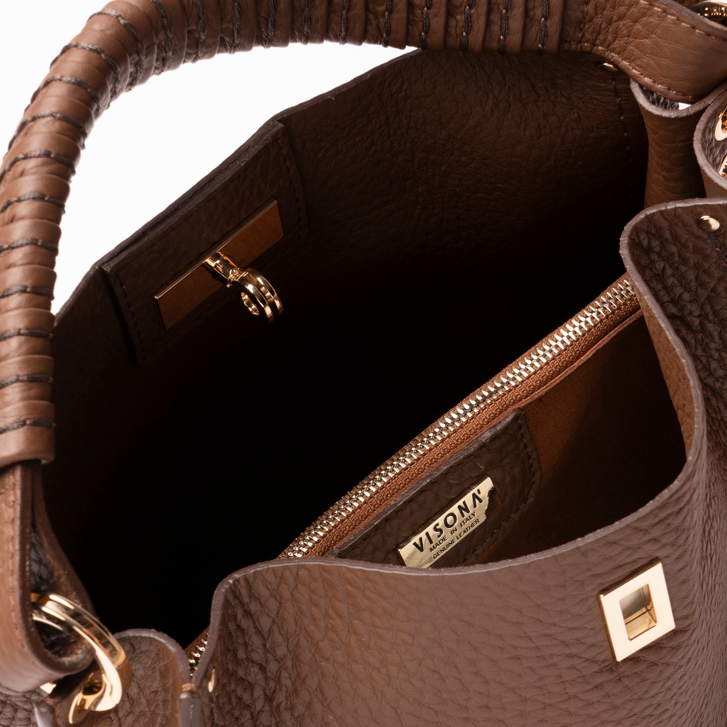 Handle covered in braided leather, enriched with the iconic VISONA' "Selleria Stitching"
