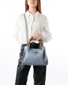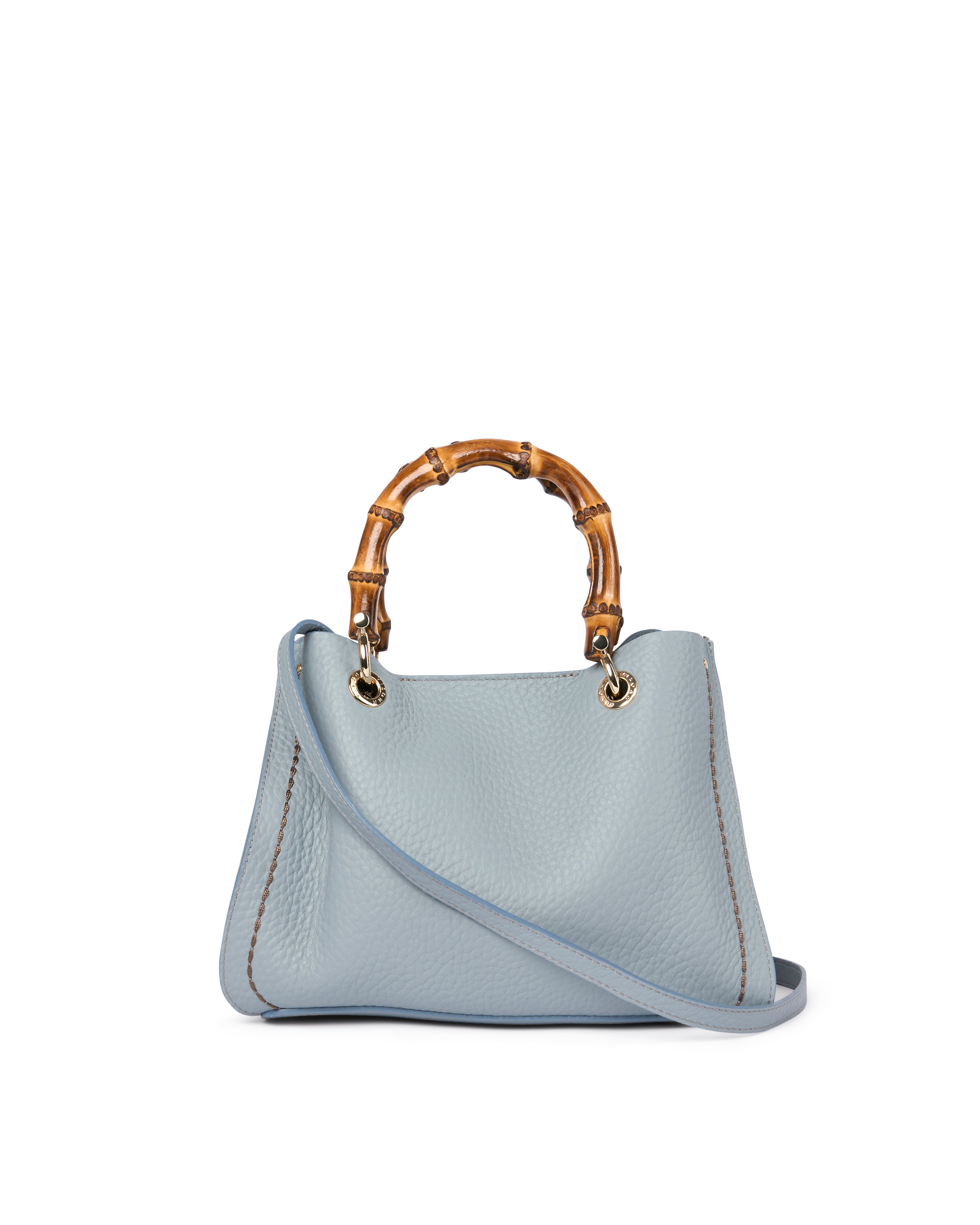 Scopri la linea Posillipo, realizzata in morbida pelle pieno fiore. Questa borsa ha un manico in bamboo e può essere portata a mano o a spalla grazie alla tracolla rimovibile. Le cuciture distintive e i dettagli in bamboo aggiungono un tocco di eleganza. 100% Made in Italy.